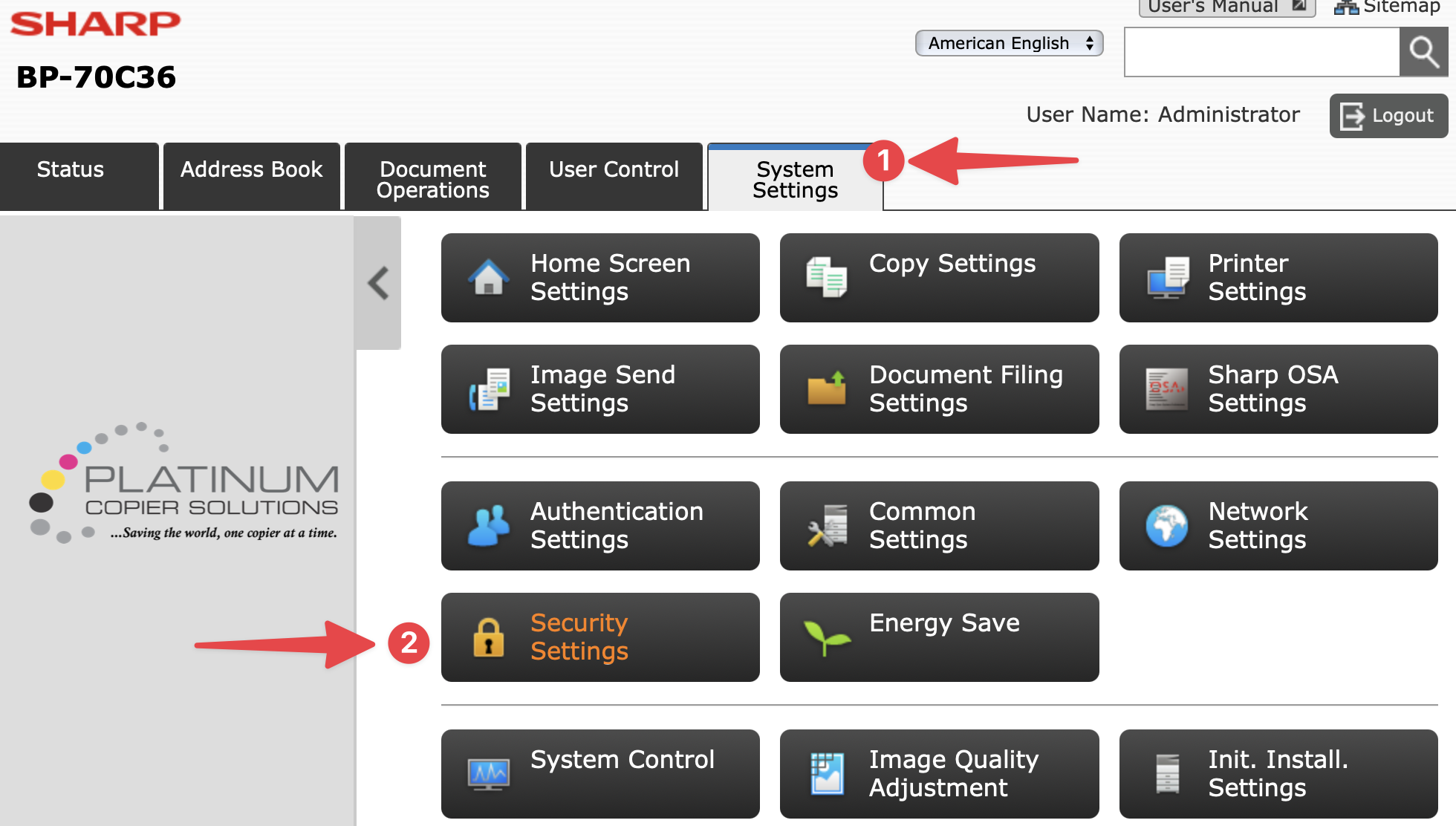 - From the Sharp copier touch panel, Tap Settings. From the copier GUI click Admin login to start.