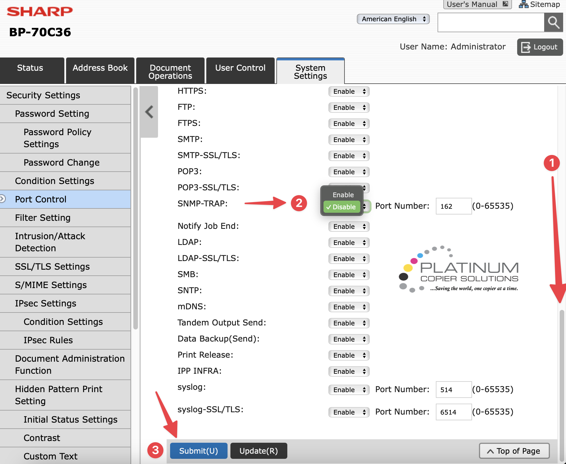 - Scroll down and change the drop-down menu on SNMP-TRAP to disable, then click Submit.