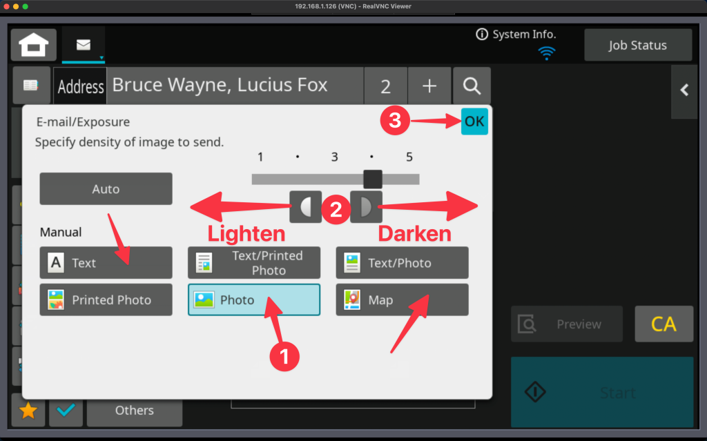 - Tap Exposure then choose which type of original you are scanning – Photo, map, text/photo, etc. Adjust lightness and darkness left or right, then tap OK, the Start.