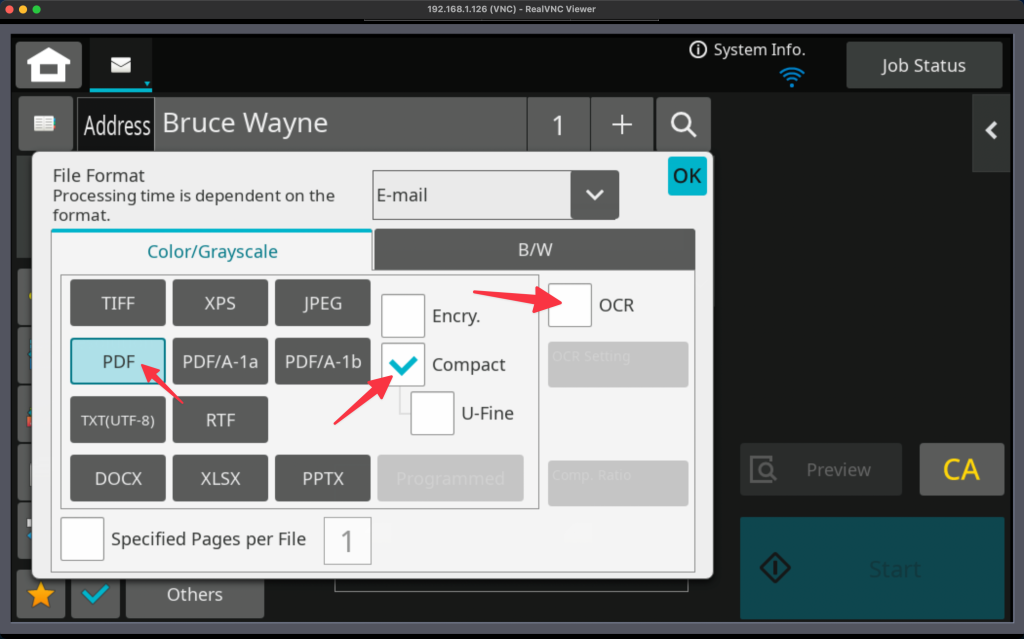 - Tap the File Format button. Choose your desired file format. On Advanced models you will have the option to scan to Microsoft Office formats, and an option for Compact PDFs and OCR.